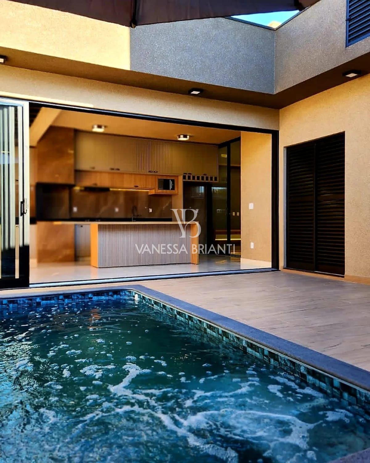 🔸 Área Gourmet fantástica com pergolado e integração com piscina, sala de jantar e sala de TV.