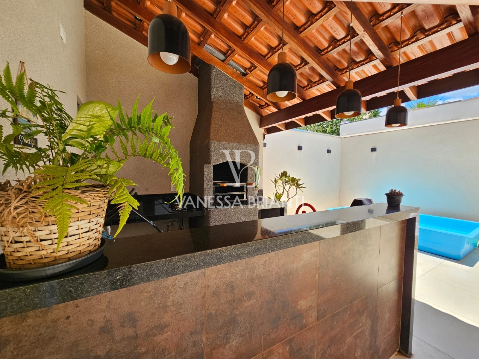Área de churrasqueira com banheiro e um quarto